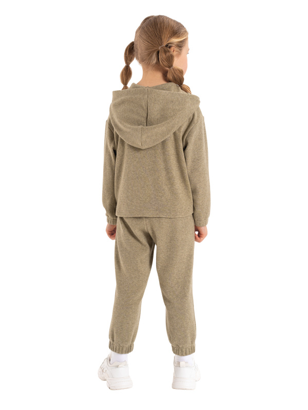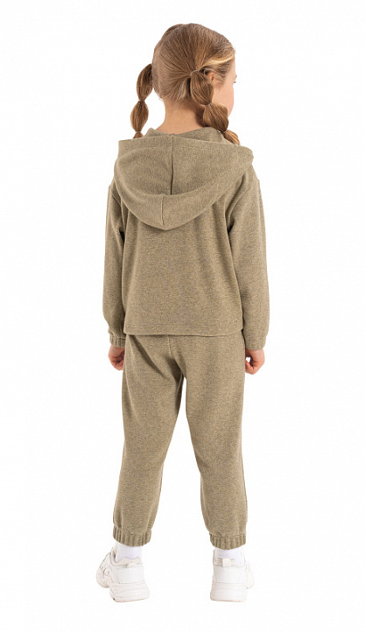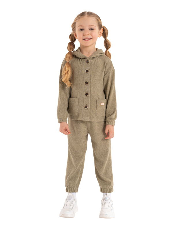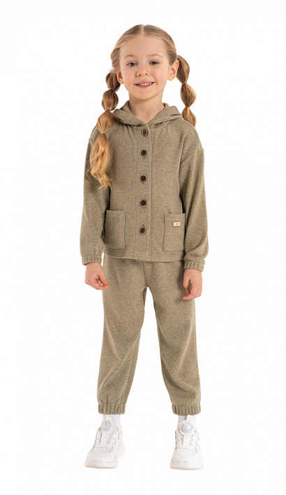 Джемпер из смесового плотного, мягкого трикотажа, спущенное плечо, на полочке два накладных кармана, на левом кармане нашивка, застежка в виде цельнокроеной планки с пуговицами, длинные рукава с цельнокроеными манжетами и эластичной лентой, капюшон.
