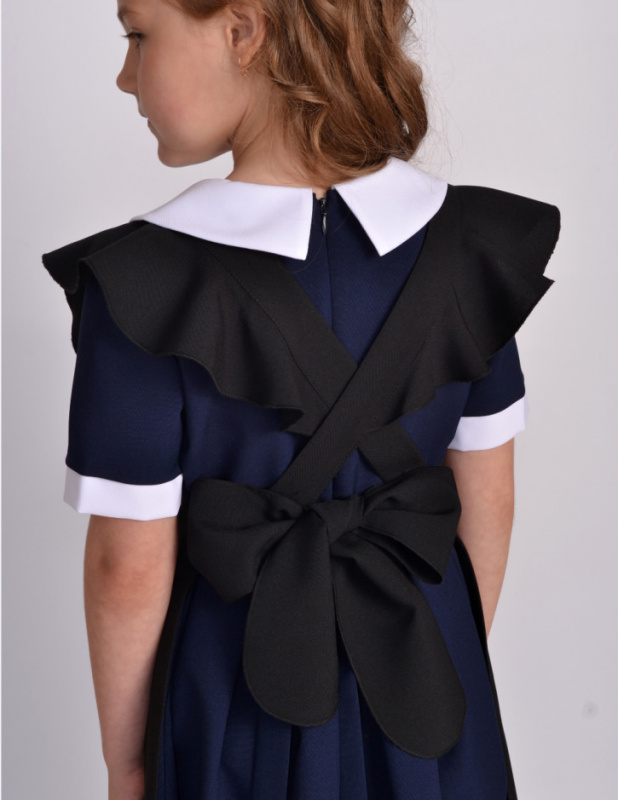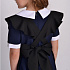 Школьный нежный фартук из ткани "габардин", с рюшами. В нагруднике кармашек. Бретели удобно регулируются на пуговицах. Пояс завязывается на пышный бант.