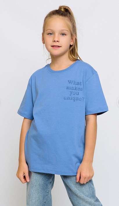 Футболка для детей голубая с коротким рукавом из супрема. Прямая широкая трикотажная футболка изготовлена по всем стандартам безопасности детской одежды, материал не вызывает аллергии, а тело ребенка всегда дышит. Идеально подходит для лета. С одной стороны стильная вышивка в виде надписи.