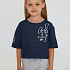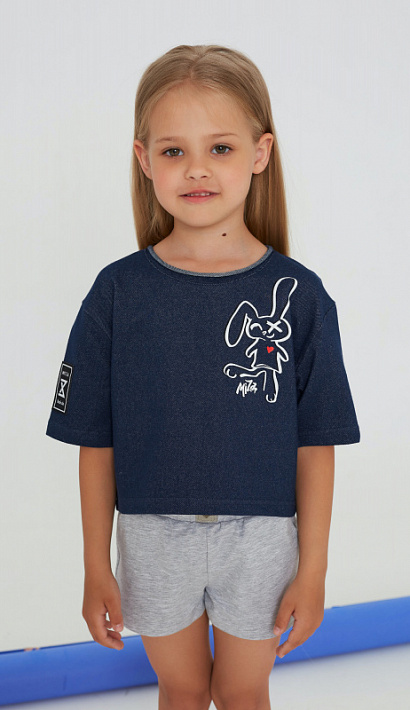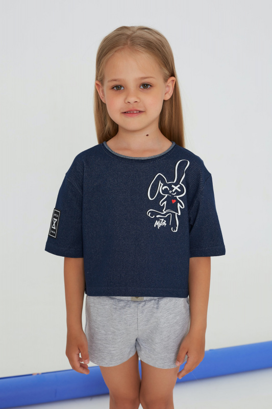 Укороченная футболка из мягкого трикотажа, имитирующего джинсу. Перед и спинка оформлены стильными п...