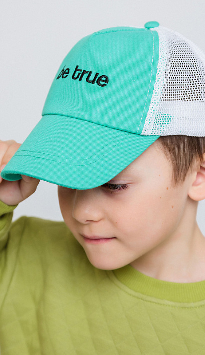 Бейсболка для мальчика бело-бирюзовая с вышивкой в виде надписи. Кепка из хлопка убережет голову от палящего солнца и перегрева. Состоит из экологически чистых материалов.