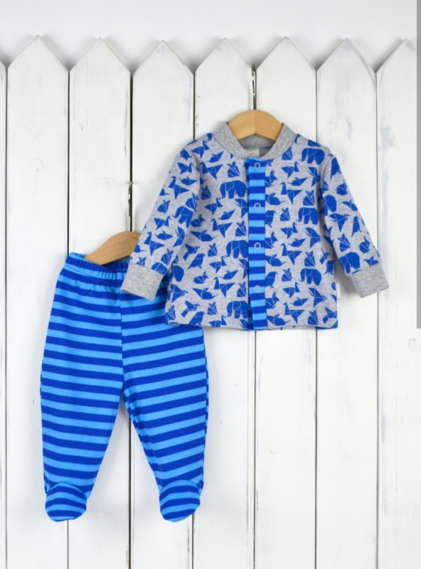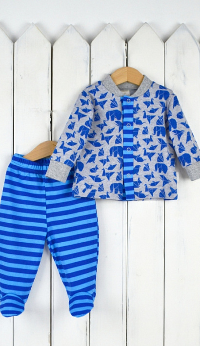 Комплект для малыша - кофточка и ползунки. Кофточка с полосатой планкой по переду, застежка на кнопках. Воротник-стойка и манжеты выполнены из контрастной рибаны