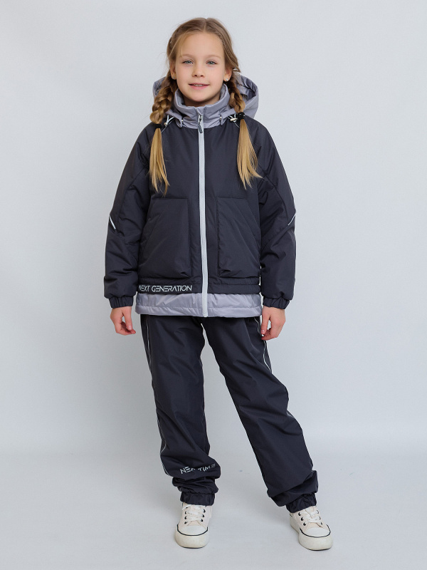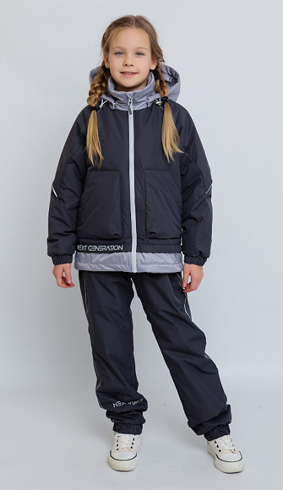 Комплект САНДРА для девочки темно-серый из мембранной ткани. Куртка на утеплителе 100, брюки без утеплителя с подкладкой из мягкого ворсового трикотажа. Подкладка спинки, полочки, верхней части рукава и внутренний воротник из мягкого ворсового трикотажа. Куртка с рукавами кроя реглан для более свободных и комфортных движений и с иммитацией двойного низа для ощущения укороченной куртки. Центральная застёжка на молнию с внутренней ветрозащитной планкой и защитой от защипа подбородка. С воротником и съёмным капюшоном на кнопках. Объёмные накладные карманы на магнитах. Низ рукавов и низ брюк - манжеты с эластичной тесьмой. Пояс брюк на задней половинке стянут эластичной тесьмой. Брюки с ремнём из стропы. Светоотражающие элементы: кант в пройме полочек, подрезе спинки, термотрансферы на спинке, по низу правой полочки и по кругу на правой половине брюк.
