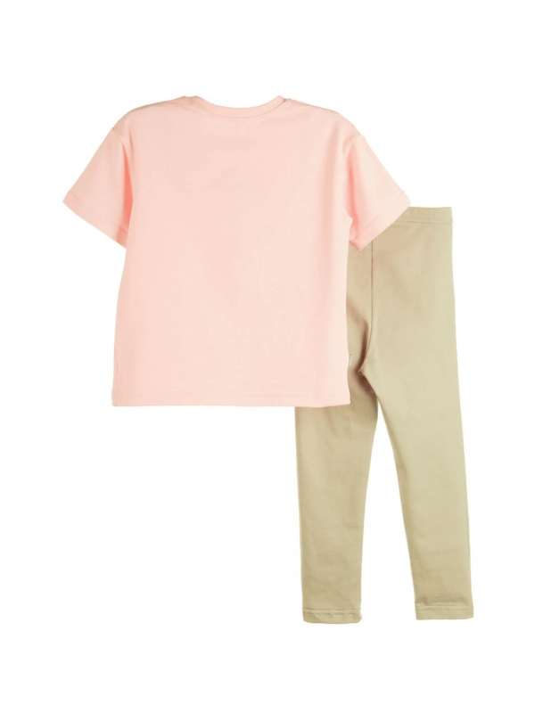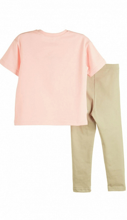 Комплект для девочки состоит из футболки и легинсов. Футболка для девочки силуэта оверсайз со спущенной линией плеча. Спереди классный принт. Легинсы облегающие, длинные. Костюм для девочки изготовлен из кулирки с эластаном (92% хлопок, 8% эластан), идеально подходит для активного образа жизни вашей маленькой принцессы. Мягкий, уютный и стильный костюм для девочки легко будет применим для прогулок, сада и активного отдыха.