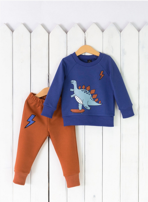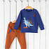 Комплект для мальчика. Выполнен из футера 3-нитки с начёсом (плотность 280г/м2), состав 80% хлопок, 20% полиэстер. По переду джемпероа и на правой детали брюк расположены принты.