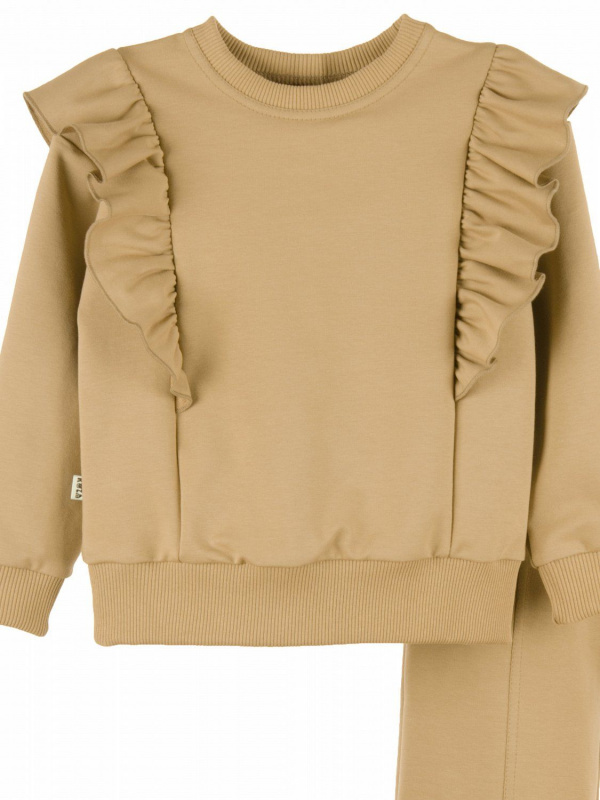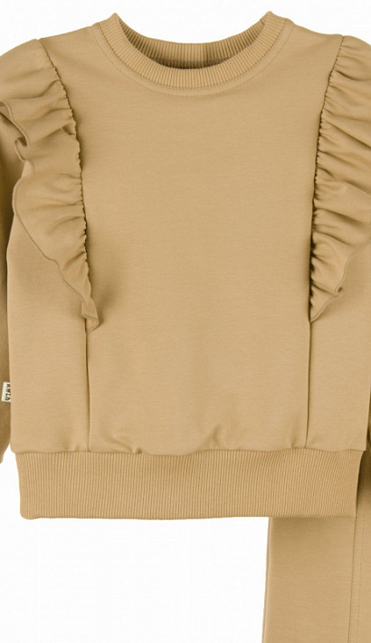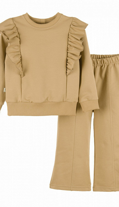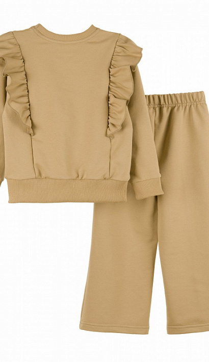 Комплект для девочки KUZA состоит из свитшота и брюк. Свитшот для девочки на манжетах из кашкорсе. Спереди декоративные рюши. Брюки для девочки средней посадки, расклешеные к низу, по переду брюк декоративная отстрочка. Комплект изготовлен из 2-х ниточного петельчатого футера с полиэстером (80% хлопок, 20% полиэстер). Костюм для девочки прост в уходе, выдерживает максимальное количество стирок, не изнашивается и не теряет форму.