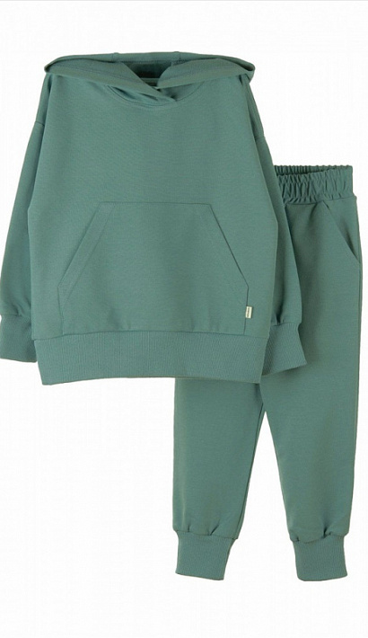 Худи модели "оверсайз", со спущенной проймой, рукав на манжете. По низу худи манжет. Спереди карман "кенгуру". Брюки на манжете, с карманами с отрезным бочком. Изготовлен костюм из петельчатого футера с эластаном.
