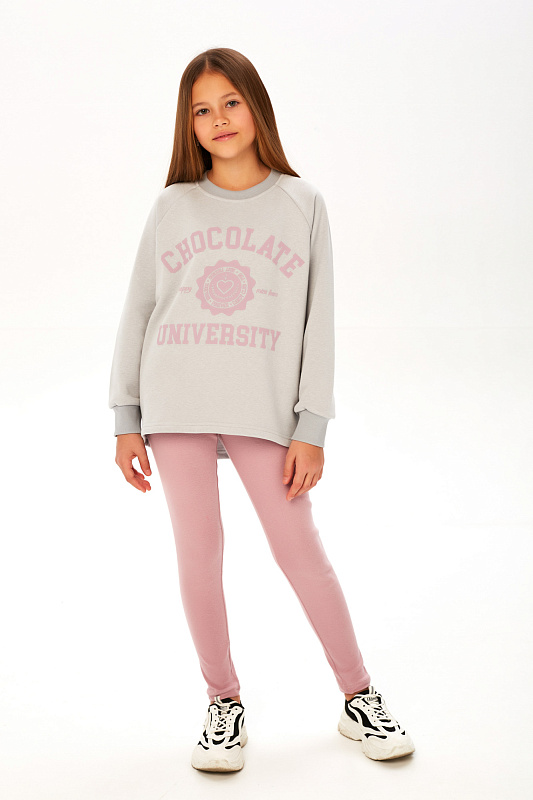 Состоит из удлиненного свитшота свободного кроя, выполненного из мягкого уютного футера с петельной изнанкой и легинсов из эластичного трикотажа.