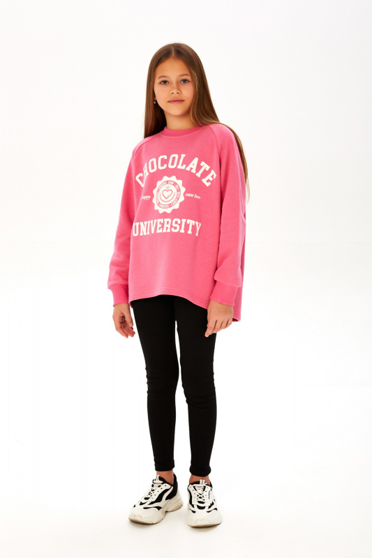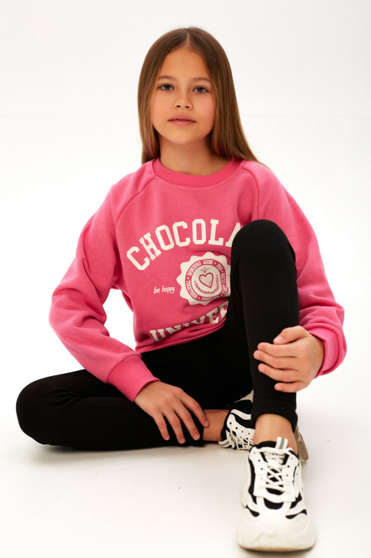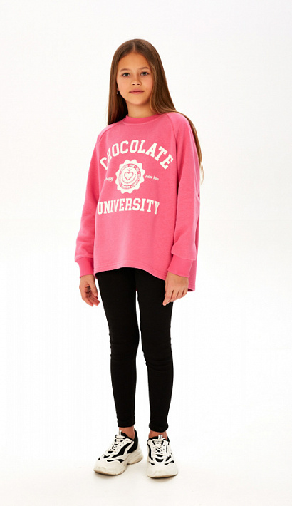 Состоит из удлиненного свитшота свободного кроя, выполненного из мягкого уютного футера с петельной изнанкой и легинсов из эластичного трикотажа.