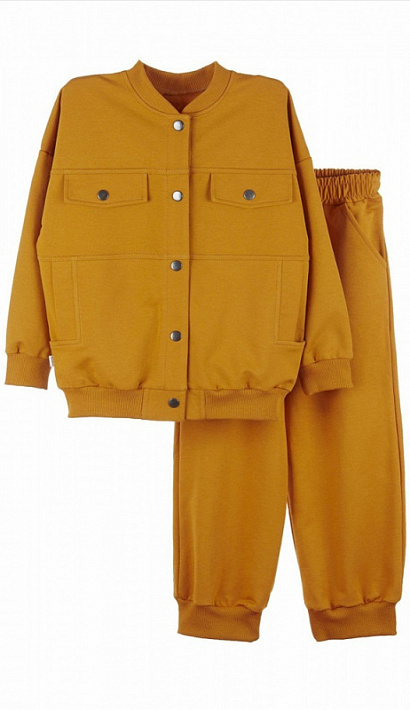 Бомбер на кнопках, с двумя удобными карманами. Широкие брюки-карго на манжетах и карманами с отрезным бочком, пояс внутри с эластичной тесьмой. Костюм из 2-х ниточного футера с эластаном, без утеплителя.