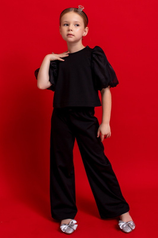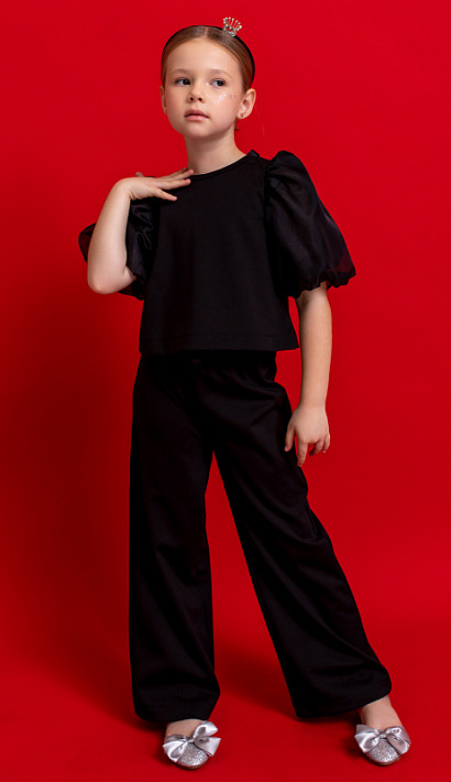 Состоит из топа с воздушными капроновыми рукавами и брюк-палаццо.