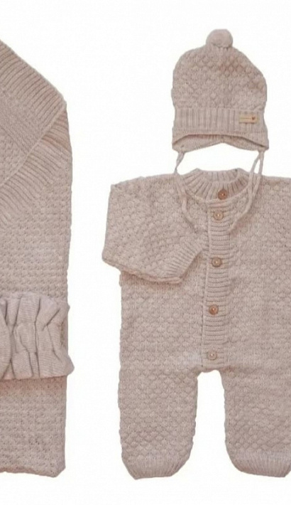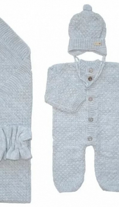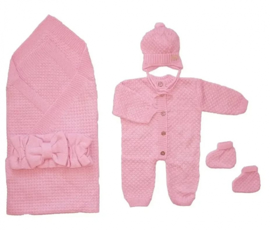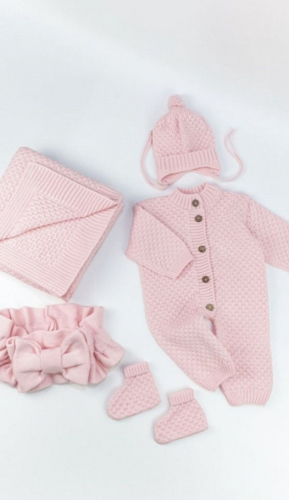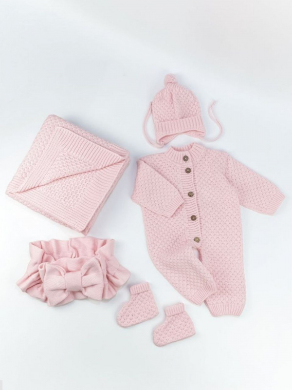Комплект на выписку: Комбинезон, шапочка, пинетки, плед, бант.