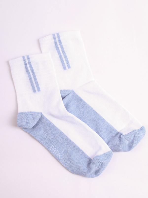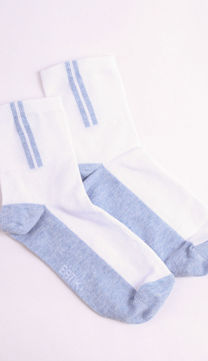 Носки детские batik бело-голубые с полосками и высоким паголенком. Носки имеют смешанный состав, благодаря чему на них не образуются катышки и они являются более износостойкими. Также носки batik являются износостойкими и не удерживают влагу, благодаря чему нога останется сухой в течение длительного времени.
