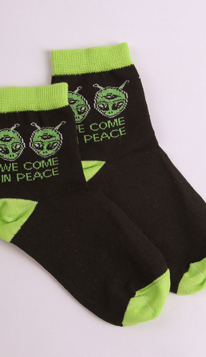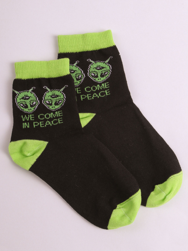 Детские носки черно-салатовые с двубортной резинкой, паголенок классический, компьютерный рисунок в виде инопланетян с надписью. Носки не теряют цвет даже после многочисленных стирок. Эластичная резинка не сдавливает детскую ногу. Носочки batik выполнены из дышащей гипоаллергенной ткани, в составе использован хлопок и полиамид.