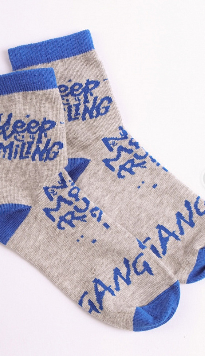 Детские носки серо-голубые с двубортной резинкой, паголенок классический, компьютерный рисунок в виде надписей-граффити. После стирки не теряют цвет и форму. Носочки для мальчиков подойдут для дома и прогулок на свежем воздухе.