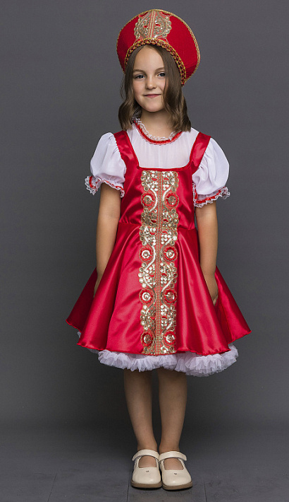 Карнавальный костюм Забавы для девочки 4-10 лет. В комплект входит красное платье с подъюбником, кокошник. Костюм украшен золотистой тесьмой.