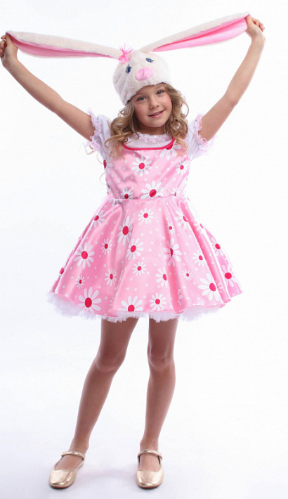 Карнавальный костюм Зайка Леля для девочки. В комплекте розовое платье и шапочка с ушками. Платье с коротким рукавом и принтом в виде цветочков. Пышная юбка , по краю рукава и воротнику оборки. Яркий и красивый наряд для праздника.
