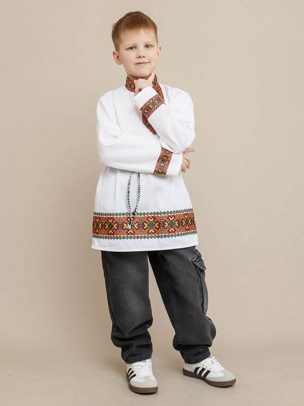 В комплекте белая рубаха с национальным орнаментом – свободный крой для комфорта, украшена красочной вышивкой в народном стиле. Пояс дополняет образ, подчеркивая традиционный колорит.