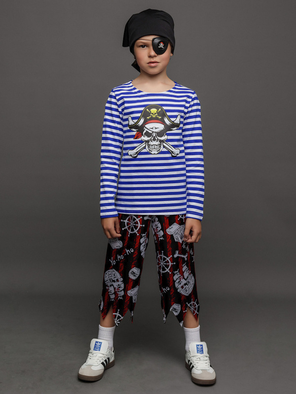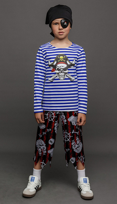 Карнавальный костюм Пирата Джейка для мальчика 3-10 лет. В комплекте тельняшка, брюки, бандана, повязка на глаз. Тельняшка с длинным рукавом и печатью в виде пиратского черепа на груди. Брюки с рваным низом и принтом.