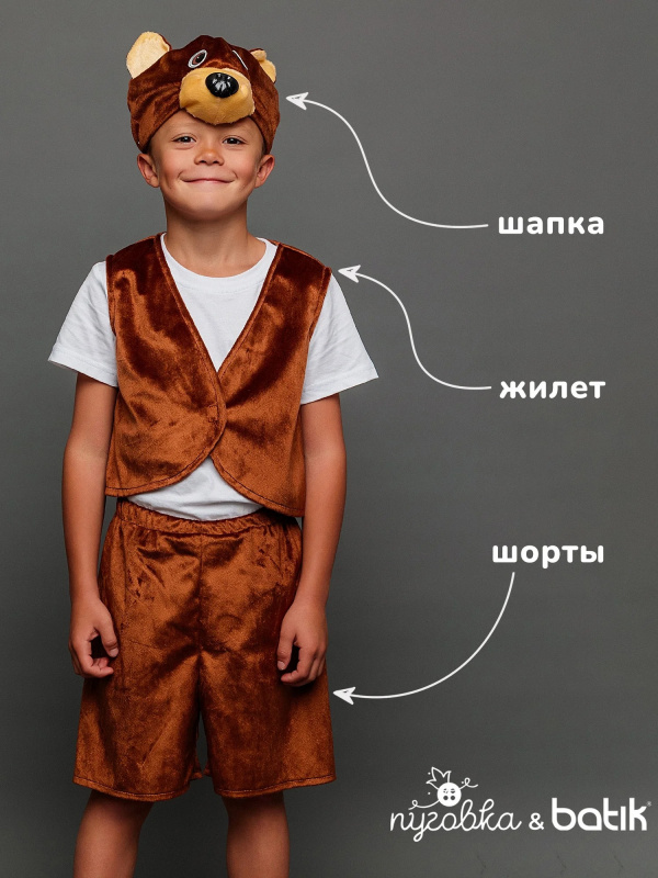 Образ славного медвежонка Потапика отлично подойдет для «домашних» мальчиков, в этом костюме они будут чувствовать себя комфортно и уютно. В таком карнавальном костюме ребенок сможет замечательно провести Новый год, а также сыграть в спектакле. В комплект образа входит жилет, шортики и шапочка.