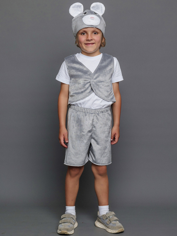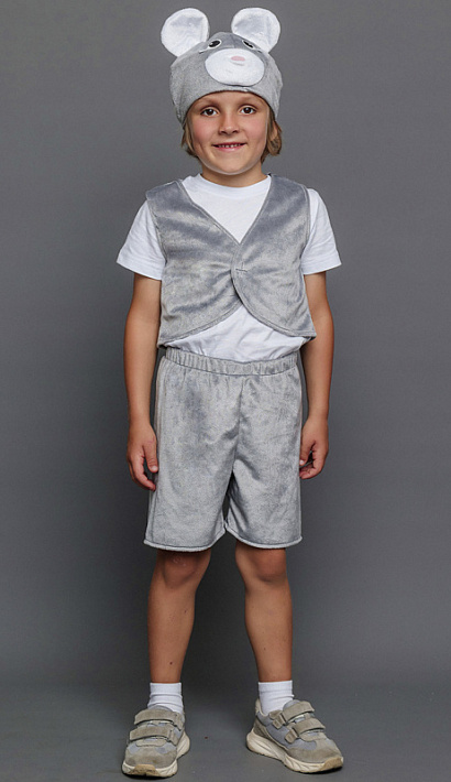 Костюм Мышонок Масик детский – простой, но очень милый карнавальный образ для костюмированных праздников в детском саду. Универсальный размер рассчитан на мальчиков и девочек от 4 до 6 лет. Комплект состоит из серой жилетки, шорт и шапки-маски.