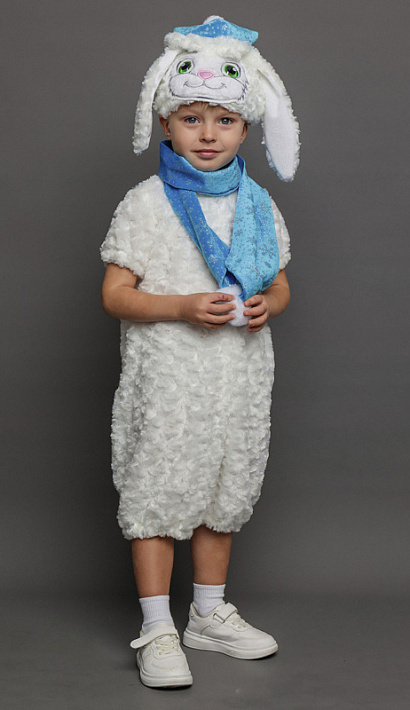 Карнавальный костюм Зайчик Федя для мальчика 2-4 лет. В комплекте плюшевый комбинезон, шапка, голубой шарф. Детский костюм Зайчика станет отличным приобретением для сказочного новогоднего утренника или спектакля.