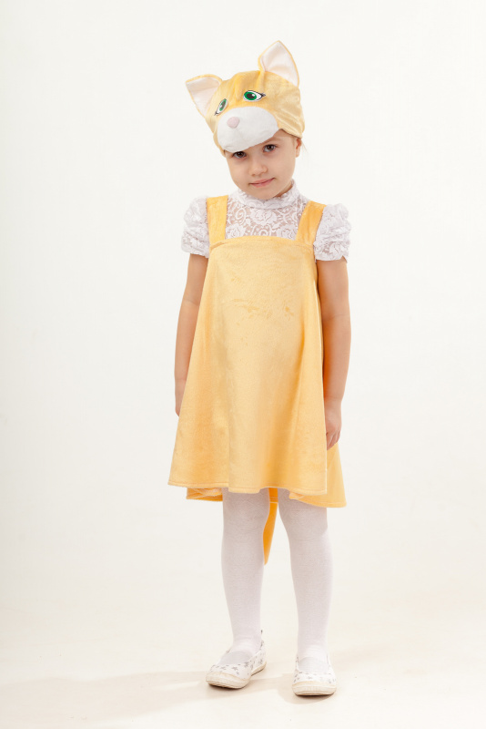 Карнавальный образ Кошка Ася состоит из сарафана и маски желтого цвета. Под сарафан можно надевать любую удобную одежду.
