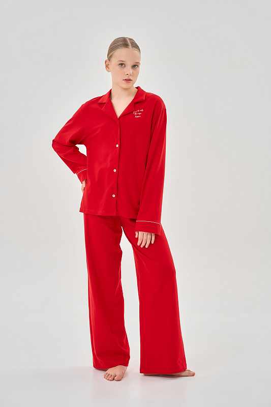 Комплект состоит из рубашки свободного кроя с длинным рукавом, оформленной принтом, и свободных брюк с декоративным бантом.