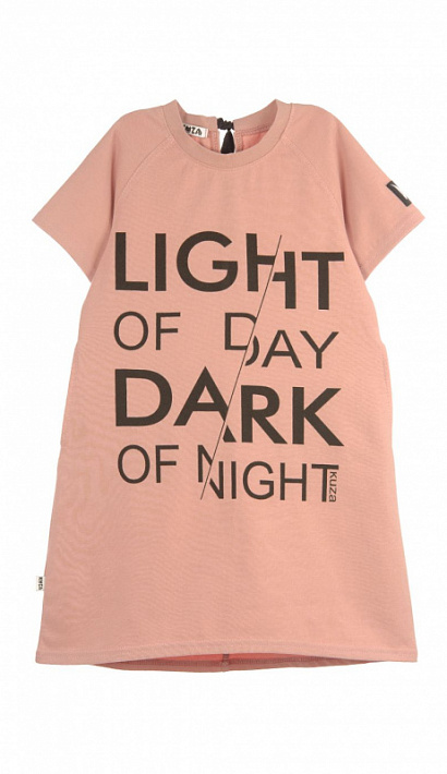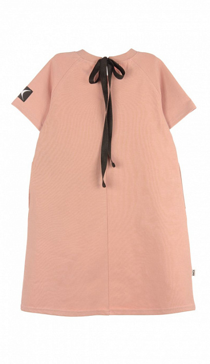 Платье с коротким рукавом, спереди принт. По спинке декоративный шов и завязка контрастного цвета. Изготовлено платье из кулирки с эластаном.