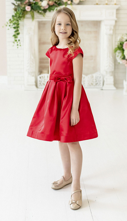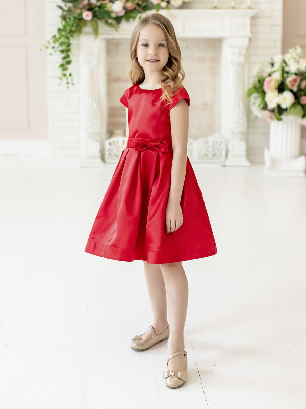 Нарядное атласное платье красного цвета с пышной юбкой из сатина. Короткий рукав, спереди бант. Подкладка 100% хлопок.