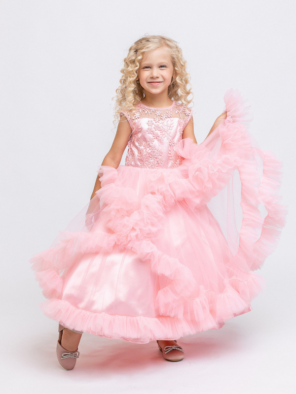 Нарядное платье с пышной юбкой из сетки. Длинное платье в яркой персиковой расцветке с цветочным узором на лифе. Подкладка 100% хлопок. Праздничное платье подойдет на выпускной в детский сад и школу. Платье выполнено из мягкого сатина с блестящим топом и пышной юбкой.
