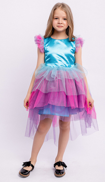 Платье Мелоди детское нарядное разноцветное. Пышная многослойная юбка со шлейфом. Блестящий атласный лиф. Короткие рукава с оборками. Завязка на спинке. Нарядное пышное платье подойдет для любого торжества.