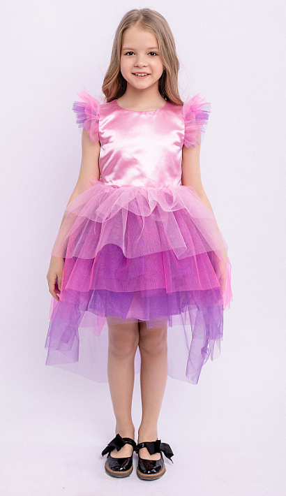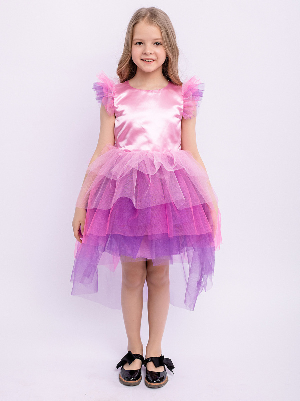 Платье Мелоди детское нарядное разноцветное. Пышная многослойная юбка со шлейфом. Блестящий атласный лиф. Короткие рукава с оборками. Завязка на спинке. Нарядное пышное платье подойдет для любого торжества.