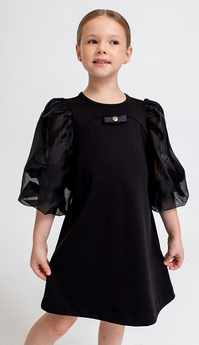 Лаконичное платье из мягкого гладкого трикотажа с объёмными рукавами из полупрозрачного капрона. Спе...