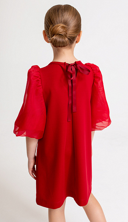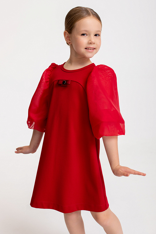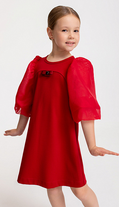Лаконичное платье из мягкого гладкого трикотажа с объёмными рукавами из полупрозрачного капрона.