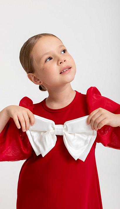 Спереди декоративный съемный бант, который можно заменить на маленький бант в тон платья (в комплекте).
