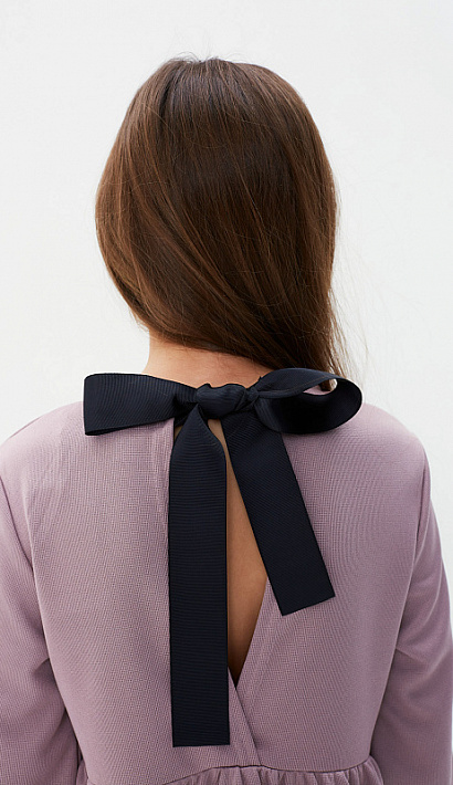 На спине глубокий разрез, оформлен бантом из черной отделочной широкой ленты.