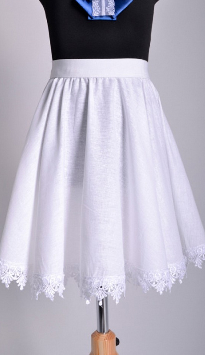 Красивый школьный подъюбник на мягкой резинке, из натуральной ткани. Придает дополнительную пышность. Однослойный. Цвет белый. Украшен широким кружевом по подолу.  Подходит для всех школьных платьев Выбирайте на один рост с платьем.