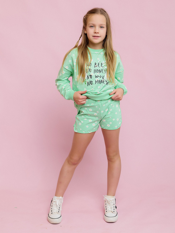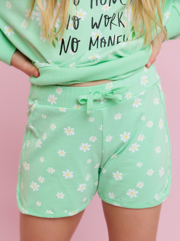 Шорты для девочки трикотажные на резинке. Спортивные шорты от batik в мятном оттенке с принтом в виде ромашек − идеальная летняя модель для ярких образов. Модель выполнена из эластичного супрема.
