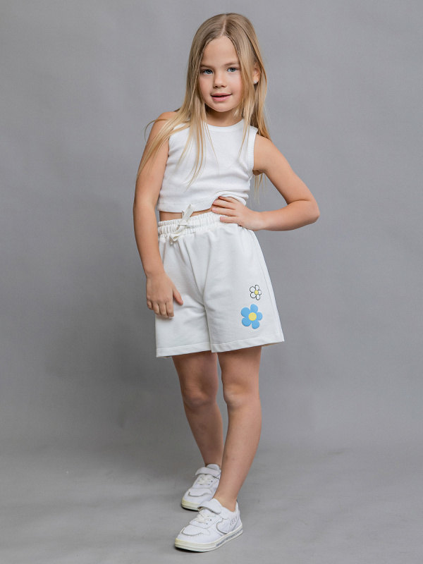 Шорты для девочки трикотажные удлиненные в молочном оттенке из футера. Выполнены из качественного износостойкого хлопка. Ткань не потеряет свой первоначальный вид после множества стирок. Имеют широкий эластичный пояс с шнурком. С одной стороны рисунок в виде цветов.