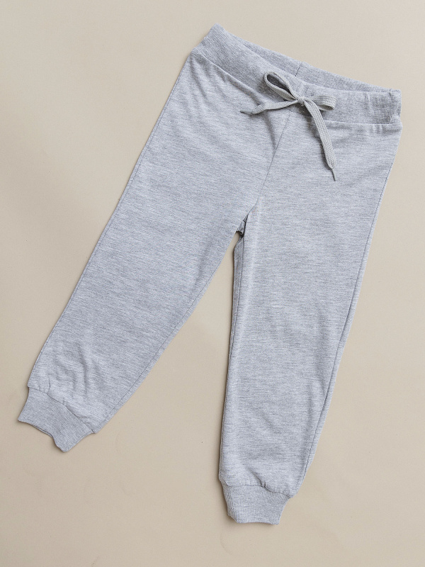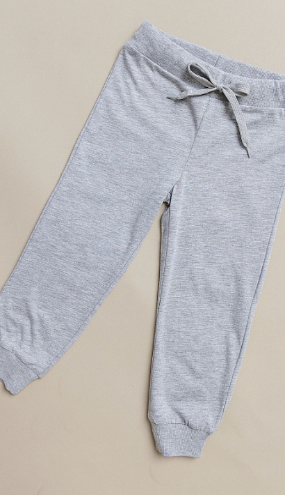 Брюки для мальчика в расцветке серый меланж из натурального хлопка. Универсальные спортивные брюки на резинкею. Крой слегка зауженный к низу (брючины с манжетами), изделие без карманов.