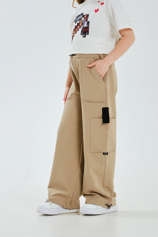 Пояс на мягкой эластичной резине, по низу брюк эластичная регулируемая затяжка.