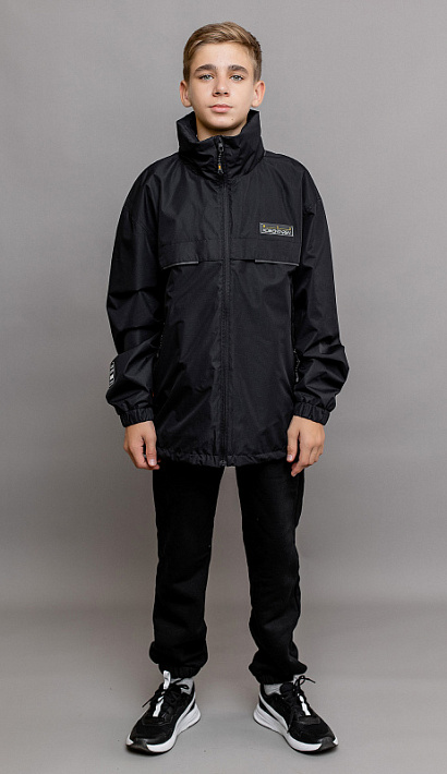 Ветровка для мальчика Гудвин в стиле спорт-шик в черном цвете. Капюшон-трансформер сворачивается в воротник, а спереди накладные карманы на молнии. Курточная ткань с водоотталкивающим покрытием DWR. На рукавах манжеты на резинке.